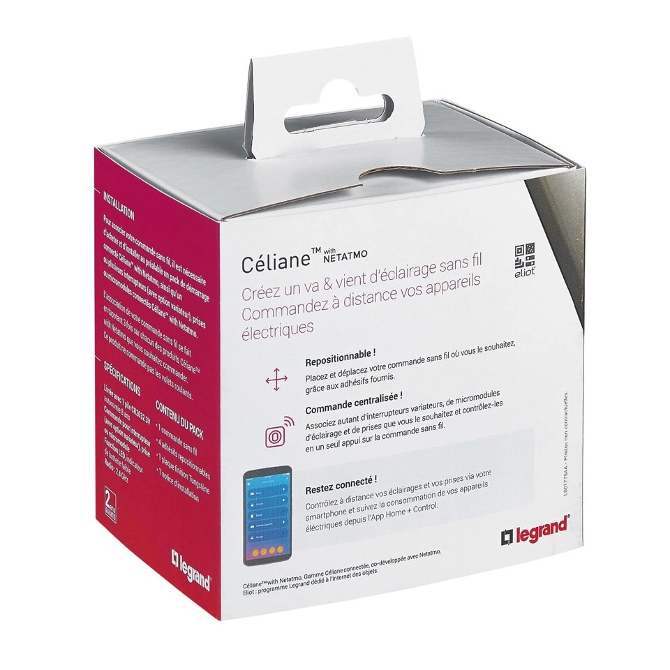 Inteligentny przełącznik bezprzewodowy umożliwia dodanie punktu kontrolnego bez okablowania lub uszkadzania ścian. Ultracienki przełącznik można w dowolnym momencie zmienić. Steruje inteligentnymi elementami systemu komfortu domowego Legrand - przełącznikami przewodowymi, mikromodułami oświetlenia, inteligentnymi gniazdkami i innymi elementami.