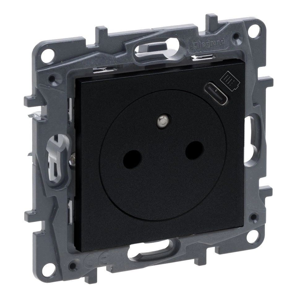 Niloe Step - Gniazdo 2P+Z 16 A - 230 V~ + ładowarka USB typ C - 1500 mA - z przesłoną, zaciski automatyczne - Czarne Legrand 863538