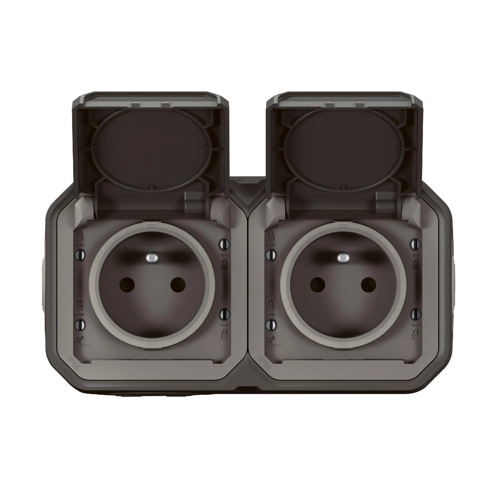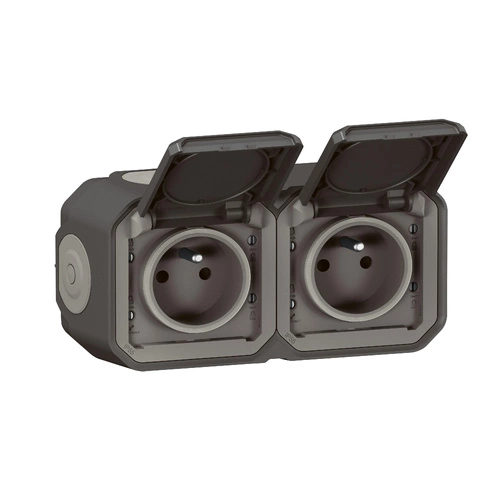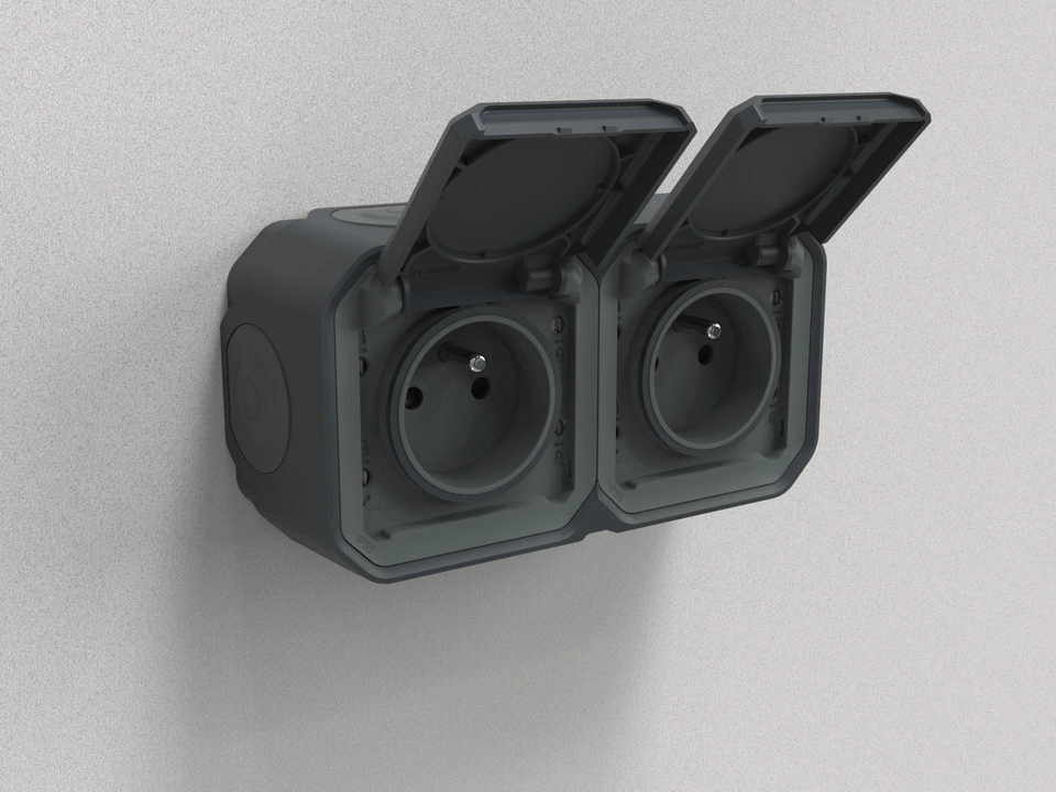 Wodoodporne podwójne gniazdo natynkowe Plexo może być używane do podłączania sprzętu elektrycznego lub elektronicznego w dowolnym miejscu, w którym wymagana jest odporność na wodę, kurz i uderzenia. Do użytku wewnątrz i na zewnątrz budynków. Kolor antracyt.- stopień ochrony IP55