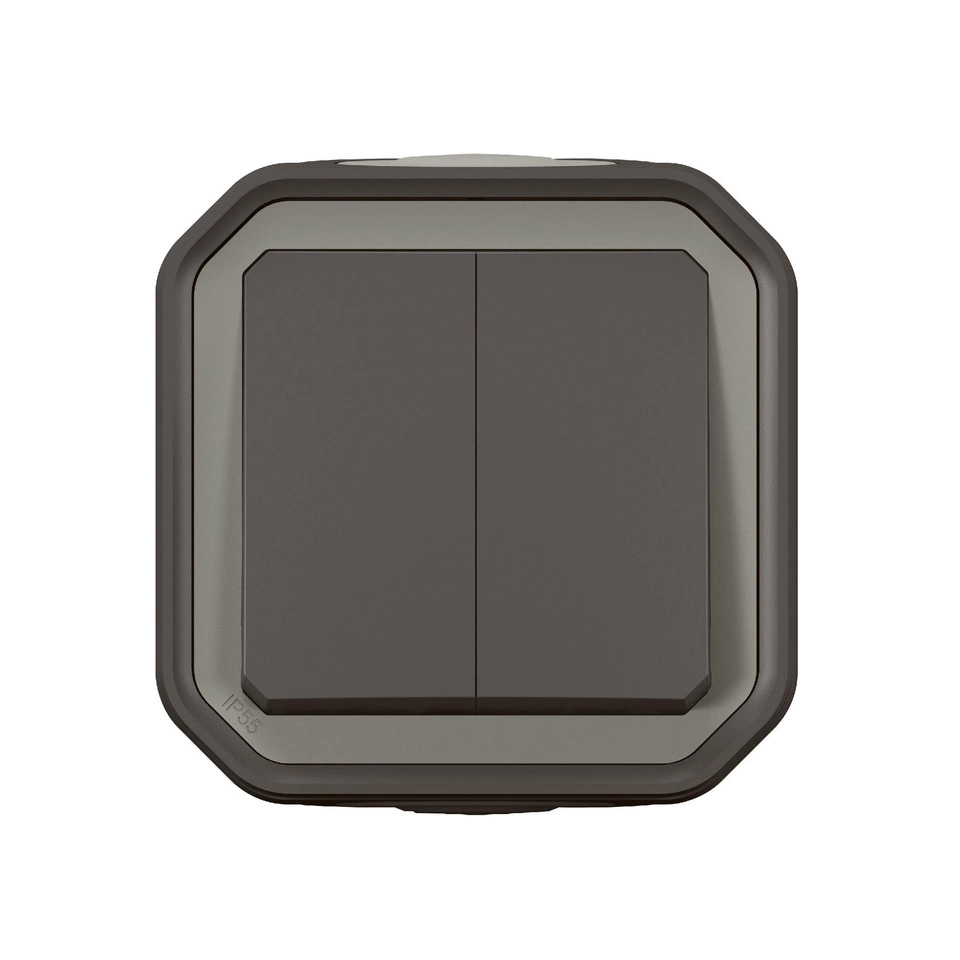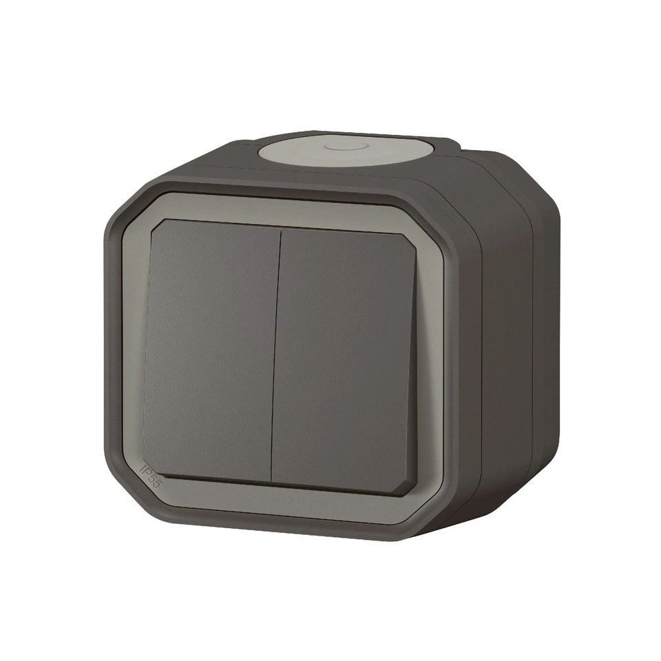 Wodoodporny natynkowy łącznik świecznkowy lub podwójny przycisk Plexo przeznaczony do sterowania dwoma obwodami oświetleniowymi. Do użytku wewnątrz i na zewnątrz budynków. Kolor antracyt.