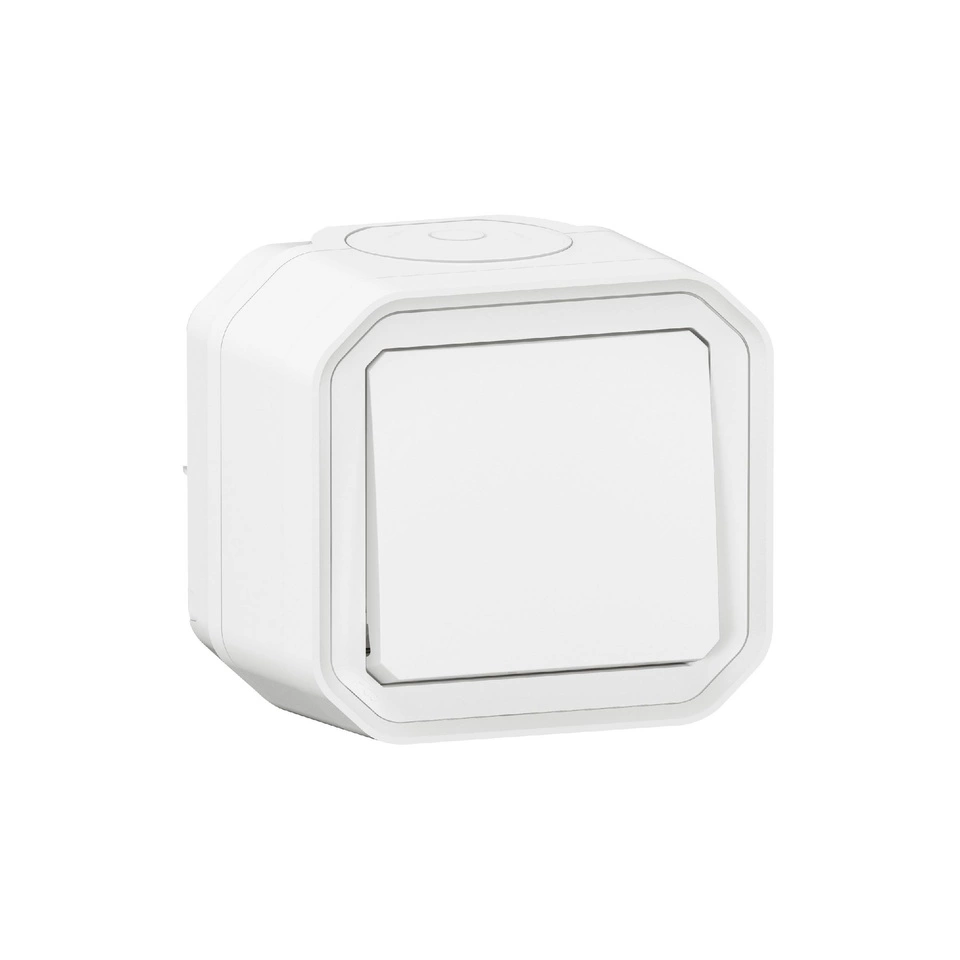 Wodoodporny łącznik natynkowy Plexo steruje jednym obowodem oświetlenia. Może być używany w trybie schodowym z drugim produktem. Do użytku wewnętrznego lub zewnętrznego. Kolor biały.