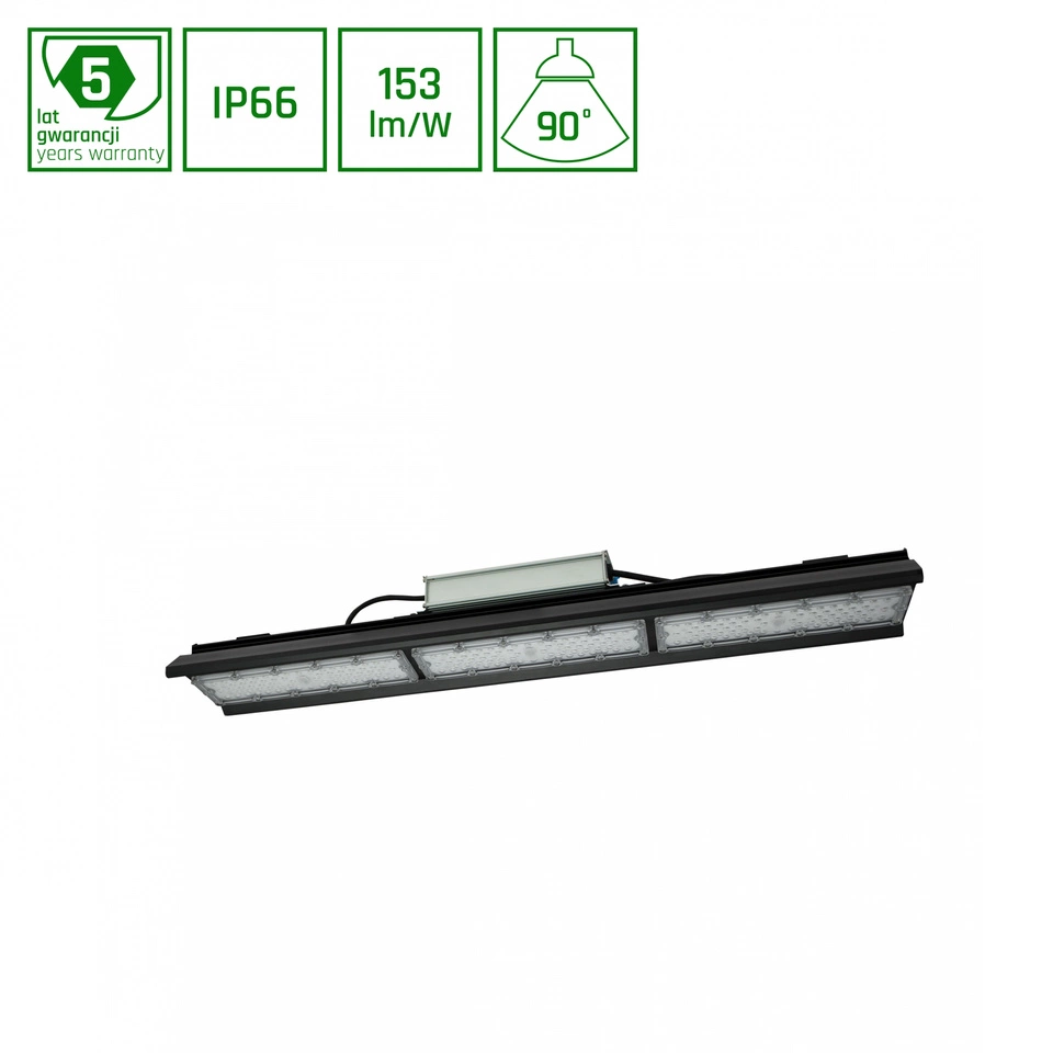 Oprawa oświetleniowa typu high bay HALLS LINE, o mocy 150 W, wysokiej skuteczności świetlnej 153 lm/W. Wykonana jest z komponentów o wysokiej jakości, potwierdzonej 5 letnią gwarancją. Posiada bardzo wysoką klasę szczelności IP66, zapewniającą ochronę przed wnikaniem pyłu oraz strumieniami wody. Klasa IK10 zapewnia odporność na uderzenia. Świeci światłem o neutralnej - najbardziej uniwersalnej barwie (4000K). Wąski kąt świecenia 90° daje kierunkowe światło, dzięki czemu można lepiej wyeksponować wybrane powierzchnie. Przeznaczona do montażu zwieszanego.