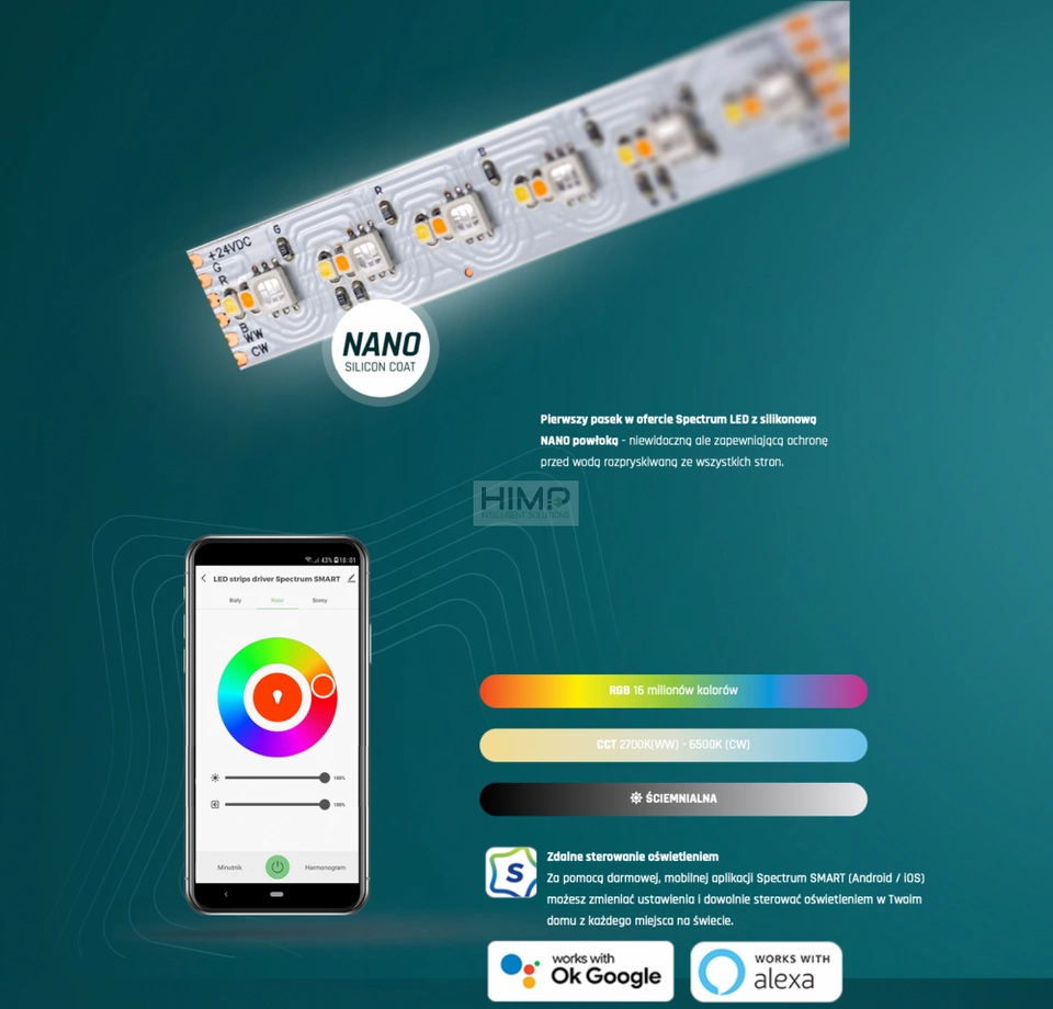 PASEK LED 20W 24V RGBW CCT 96LED/1m to innowacyjne rozwiązanie oświetleniowe, które wprowadzi nową jakość do Twojego wnętrza. Dzięki możliwości regulacji kolorów i temperatury barwowej, stworzysz niezwykłą atmosferę w każdym pomieszczeniu. Kompatybilność z mobilną aplikacją Spectrum SMART oraz asystentami głosowymi umożliwia wygodne sterowanie oświetleniem, niezależnie od pory dnia.