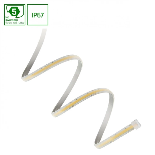 PASEK LED 55W/5m COB 24V to doskonałe rozwiązanie dla pasjonatów oświetlenia, którzy poszukują nowoczesnego i energooszczędnego źródła światła. Dzięki zastosowaniu technologii COB (Chip On Board) uzyskujemy niezwykle wydajne i równomierne rozproszenie światła, co znakomicie sprawdzi się zarówno w zastosowaniach domowych, jak i komercyjnych. Pasek LED charakteryzuje się klasą szczelności IP67, co oznacza, że z powodzeniem może być stosowany w miejscach narażonych na działanie wody i pyłu, takich jak łazienki, balkony czy ogrody.