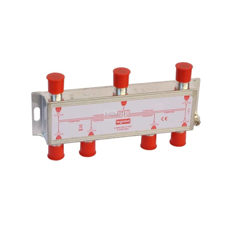 - Splitter TV - 6 wyjść ”F” 0-2400 MHz, tłumienie 11 dB