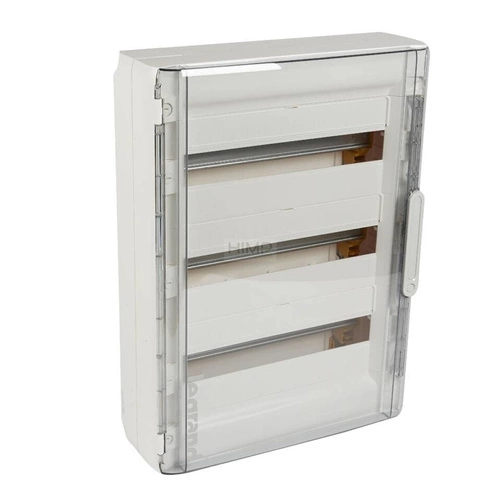 - Wyposażenie:- drzwi (przezroczyste lub białe w zależności od typu),- wyjmowana konstrukcja wsporcza z możliwością uchylania z zamontowanymi wspornikami,- płyta przepustów kablowych (górna i dolna), demontowana bez użycia narzędzi,- osłony mocowane przez 1/4 obrotu wkręta, zdejmowane pojedynczo, - listwy przyłączeniowe IP2x N+PE,- pasek zaślepek 5-modułowych z możliwością odcięcia 1 lub 0,5 modułu,- naklejki samoprzylepne do opisywania obwodów
